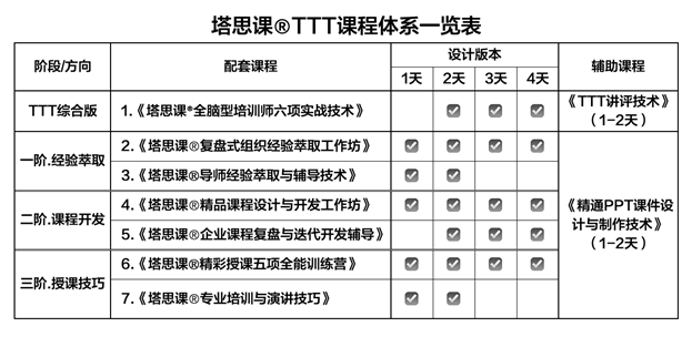 TTT3.0技術引領者,主導研發塔思課?TTT進階系統版權課程。7年磨一劍“培訓師六項實戰技術”(2008-2014),3年完成“課程設計與開發、授課技巧五項全能”兩門進級課程修煉(2015-2017)。2018推出塔思課?TTT標準化、定制化及版權化授證TTT。